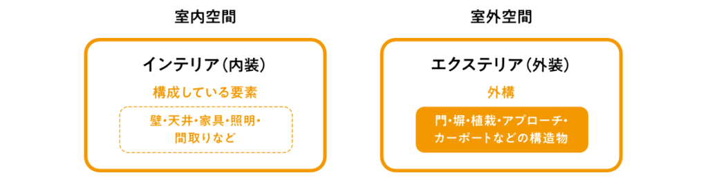 対照的な言葉では、家具や照明などで構成された部屋全体の内装を意味するインテリアが挙げられます。エクステリアもアプローチのデザインや照明で照らされた木々など、構造物(外構)で構成された外まわり全体を意味します。
