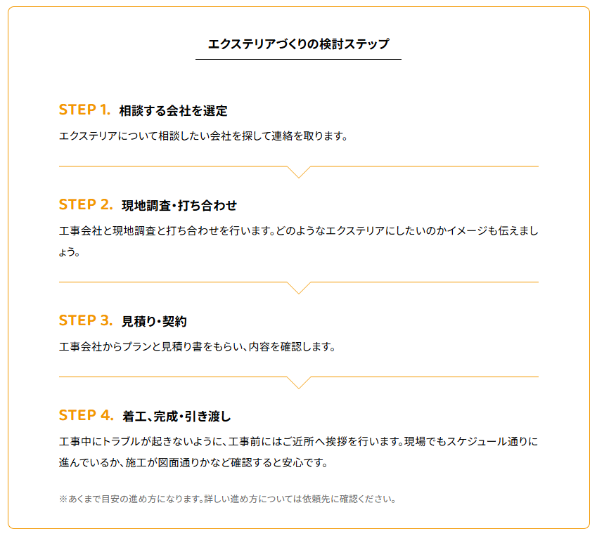 はじめに、エクステリアづくりの基本的な検討のステップをご紹介します。