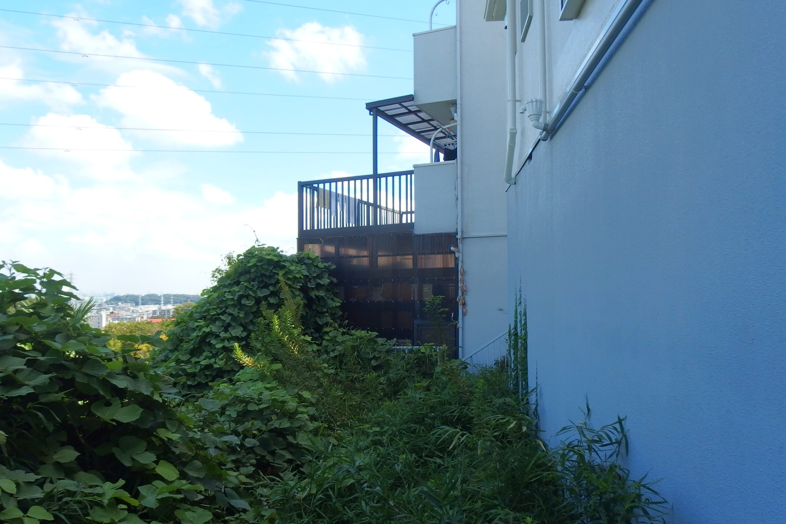 • 【工事前】建物裏で、雑草だらけの崖地。せっかくの土地を使うことができておらず、ここに高床式のデッキを設置します。