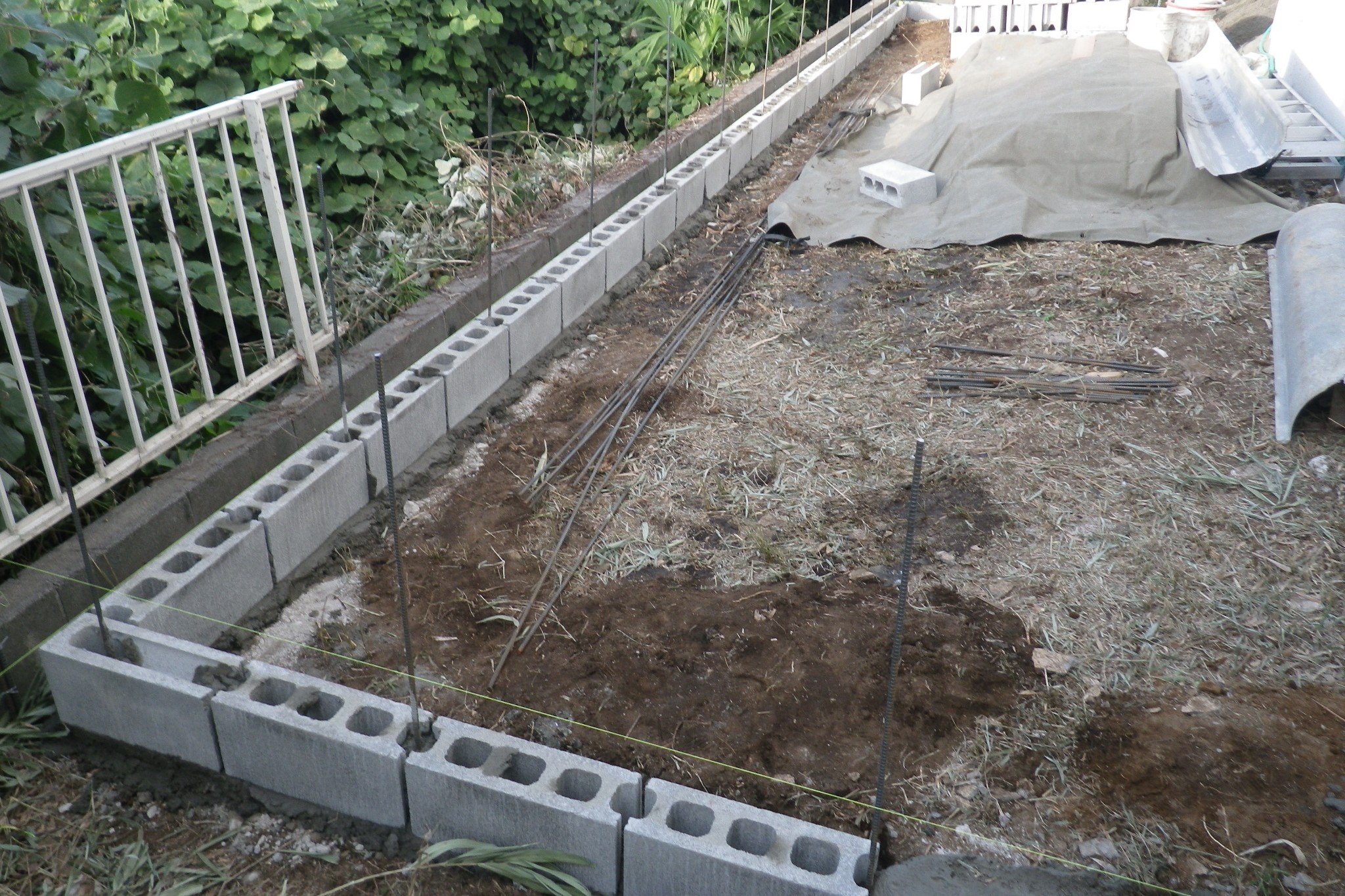 • 【施工中】地形・土の硬さなどを考慮し、コンクリートで床面・土台を作成します。そのため、まず雑草撤去・整地・外周ブロック積み。