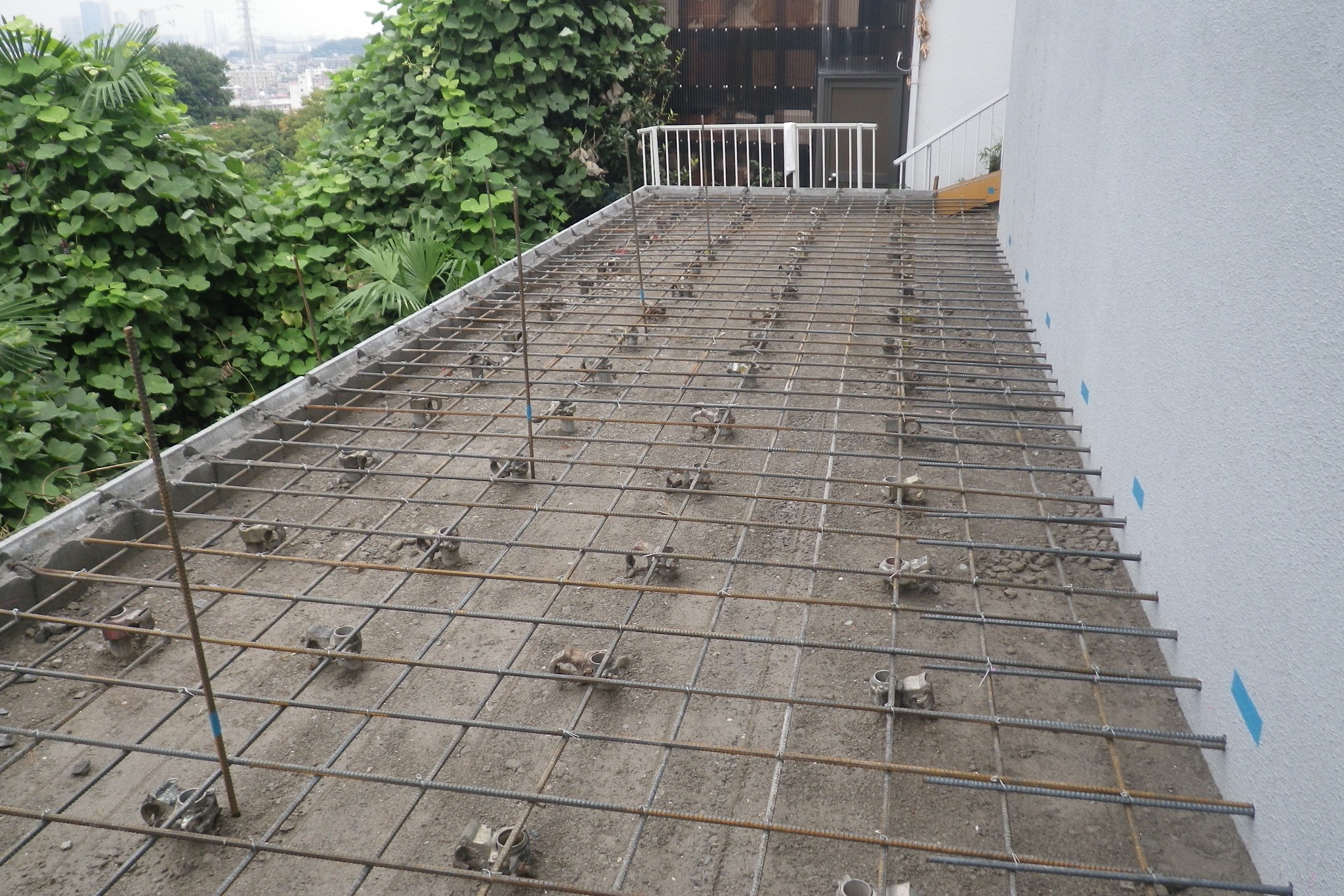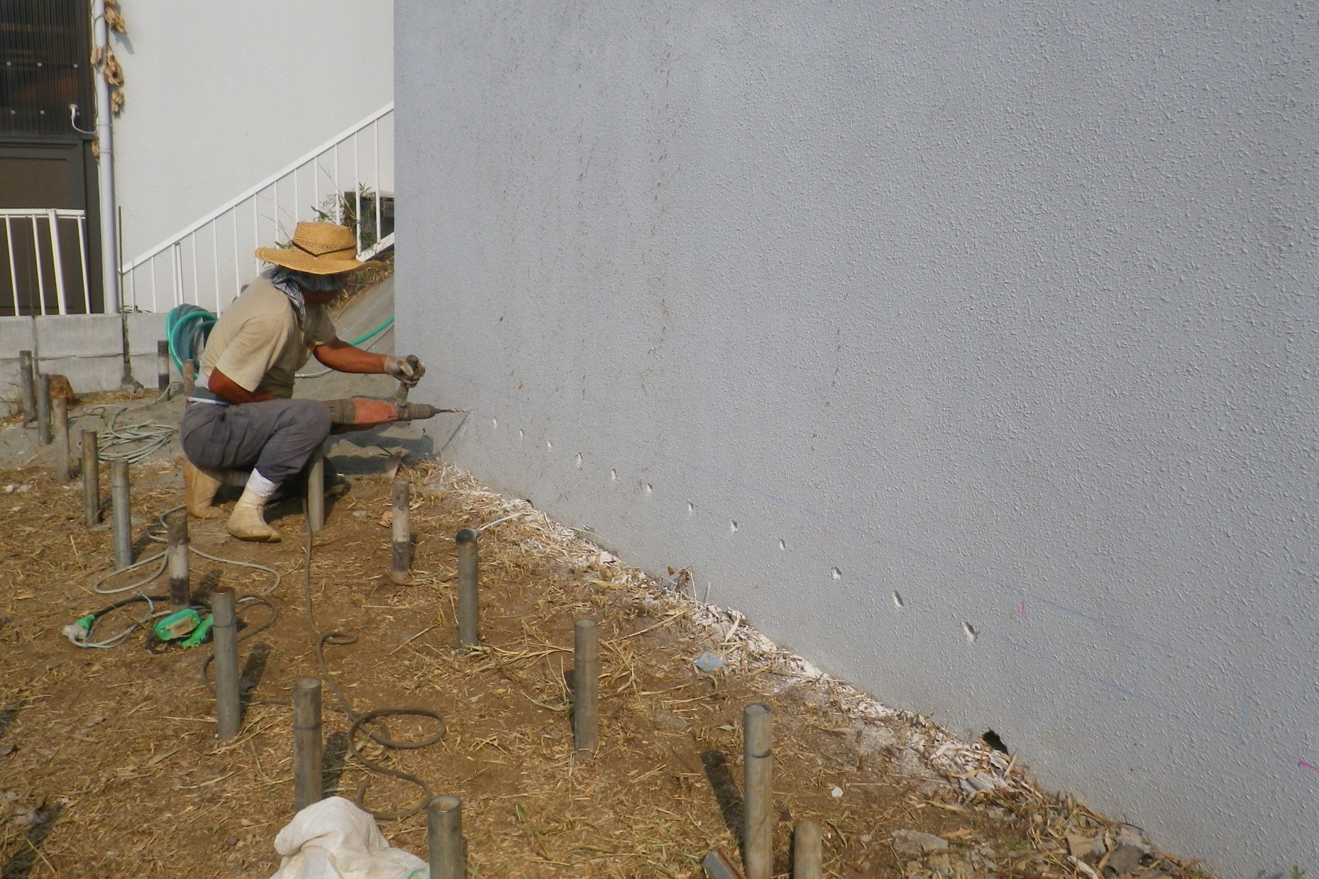 • 【施工中】建物とも固定を強くするため、差筋アンカーも行いました。