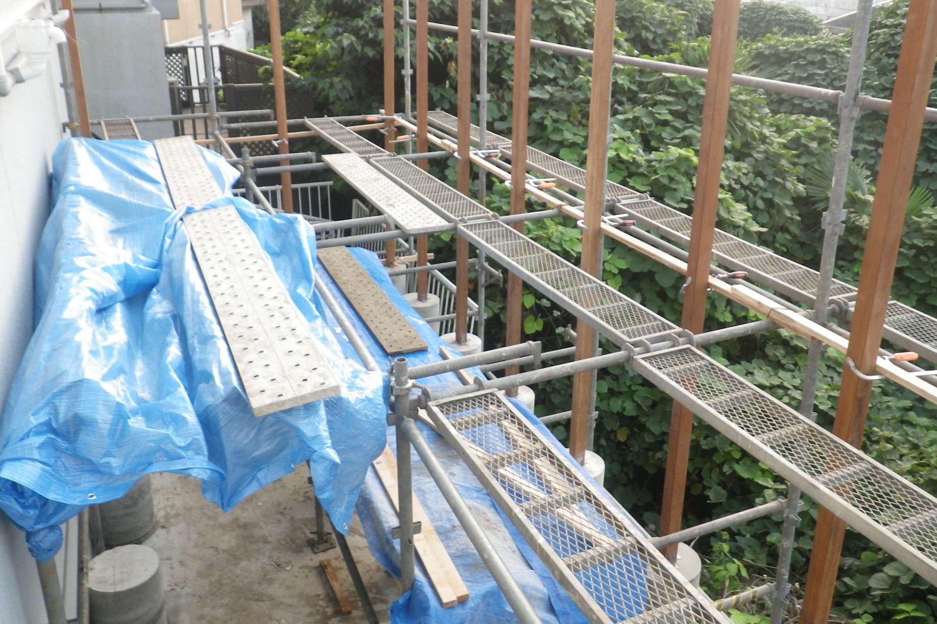 • 【施工中】地面との固定を強くするため、単管打ち込み。