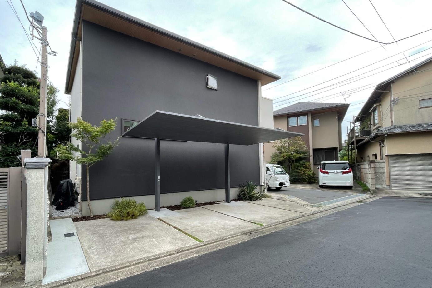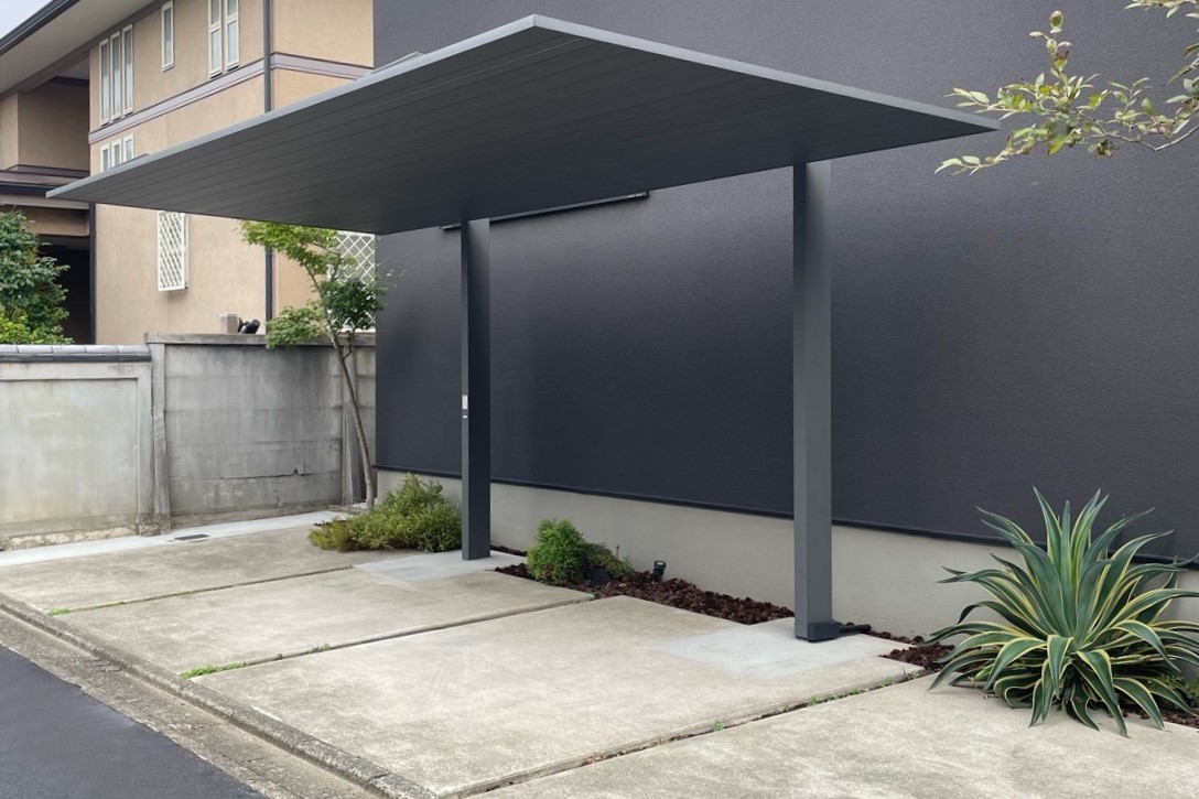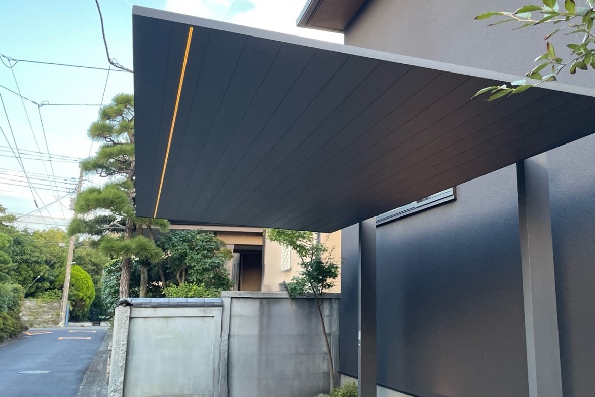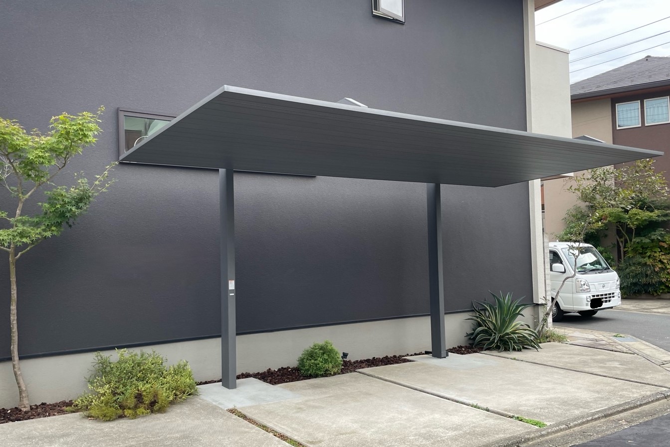 【工事完了】余計な凹凸がなく、直線的なデザイン。ビスが見えないように工夫されているなど、徹底されたノイズレスデザインのカーポート。
