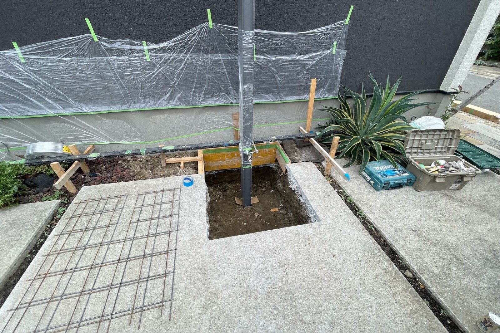 【施工中】柱立てを行い、打設準備。基礎が大きく、車が乗る位置でもあるため、基礎にも土間コンクリート同様にワイヤーメッシュを敷きます。